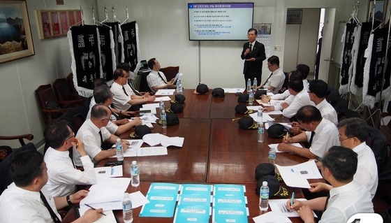대한민국 무공수훈자회 장례의전선양단원은 돌아가신 유공자들에게 국가를 대신해 예의를 다하는 역할을 맡고 있으며 역시 국가유공자로 구성돼 있다. 사진은 대한민국 무공수훈자회 장례의전선양단원들이 대통령 근조기 관련 사전교육을 받고 있는 모습. [출처 : 파이낸셜뉴스]
