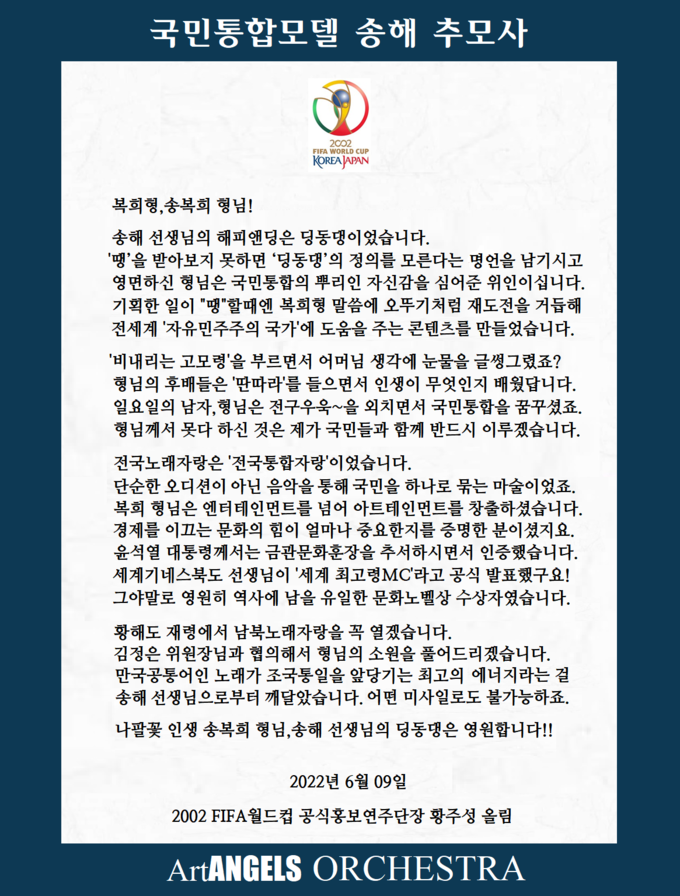 그가 송해 국민MC 영결식을 하루 앞둔 9일, 안타까운 마음으로 추모사를 썼다.