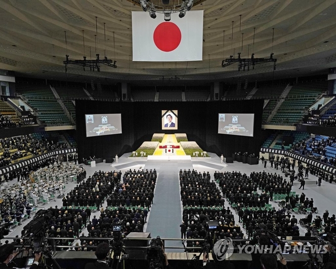 아베 신조 전 일본 총리 국장(國葬)이 27일 오후 2시 도쿄 소재 일본무도관에서 열렸다. 아베 전 총리 국장에 약 4천300여명의 국내외 인사가 참석한 모습.