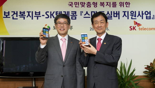 보건복지부(장관 진영)와 SK텔레콤(대표이사 하성민)은 9월 16일(월) 국민맞춤형 복지를 위한 ‘스마트실버 지원사업’ 업무협약을 체결했다. 스마트실버 지원사업이란, 어르신들을 대상으로 편리한 스마트기기 사용 환경과 함께 보건복지 앱(App) 등을 탑재하여 꼭 필요하고 유용한 보건복지 정보를 제공하기 위해 보건복지부가 추진하는 사업이다. 이번 업무협약으로 SK텔레콤은 터치스크린 사용에 익숙하지 않은 어르신들이 스마트폰 초기화면에서 쉽고 편리하게 의료, 건강, 복지, 안전 관련 정보를 얻을 수 있도록 디자인한 ‘T실버서비스’를 9월 말 출시하기로 하였다.