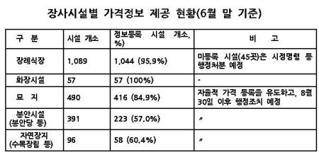 장례식장, 봉안당, 화장시설, 묘지 등 장례시설의 가격정보가 인터넷 'e-하늘 장사정보시스템'(www.ehaneul.go.kr)에 공개된다. 보건복지부는 장사시설의 가격정보 제공을 의무화하는 내용을 담은 장사법 개정안이 8월 30일 시행된다고 15일 밝혔다. 장례식장은 '장사 등에 관한 법률'에 따라 이미 올 초부터 의무적으로 임대료, 수수료, 장례용품 가격 등을 시스템에 공개하고 있다. 봉안당, 묘지, 자연장지, 화장시설 등도 일부는 자발적으로 장사정보 시스템에 가격정보, 위치 등을 등록하고 있다. 현재 장례식장 1천89곳 가운데 1천44곳(95.9%), 묘지 490곳 중 416곳(84.9%) 등이 가격정보를 공개하고 있고, 화장시설 57곳은 100% 가격정보가 등록돼 조회할 수 있다. 다만 봉안당 등 봉안시설 391곳 중에서는 223곳(57%)만이, 자연장지 96곳 중에서는 58곳(60.4%)만이 정보를 공개하고 있다.