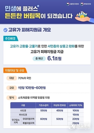 고유가 피해지원금 개요 ■ 추진배경 고유가·고환율·고물가로 인한 서민층의 삼중고 완화를 위한 고유가 피해지원금 지급 총 예산: 6.1조 원 ■ 지원대상 및 규모 · 대상: 70%의 국민 · 규모: 1인당 10만 원 ~ 60만 원 · 방식: 소득계층별·지역별 맞춤형 지원 (기초수급자) - 수도권: 55만 원 - 비수도권: 60만 원 - 인구감소지역 우대지원지역: 60만 원 - 인구감소지역 특별지원지역: 60만 원 (차상위·한부모) - 수도권 45만 원 - 비수도권: 50만 원 - 인구감소지역 우대지원지역: 50만 원 - 인구감소지역 특별지원지역: 50만 원 (소득하위 70%) - 수도권: 10만 원 - 비수도권: 15만 원 - 인구감소 우대지원지역: 20만 원 - 인구감소 특별지원지역: 25만 원 고유가 피해지원금 신청방법 ■ 신청·지급기간 - 기초·차상위·한부모 가구 1차: '26.4.27.(월)~'26.5.8.(금)까지 신청·지급 2차: '26.5.18.(월)~'26.7.3.(금)까지 신청·지급 ※ 1차 기간에 신청·지급받은 경우, 2차 기간에는 신청·지급 불가 - 70%의 국민 2차: '26.5.18.(월)~'26.7.3.(금)까지 신청·지급 ■ 신청·지