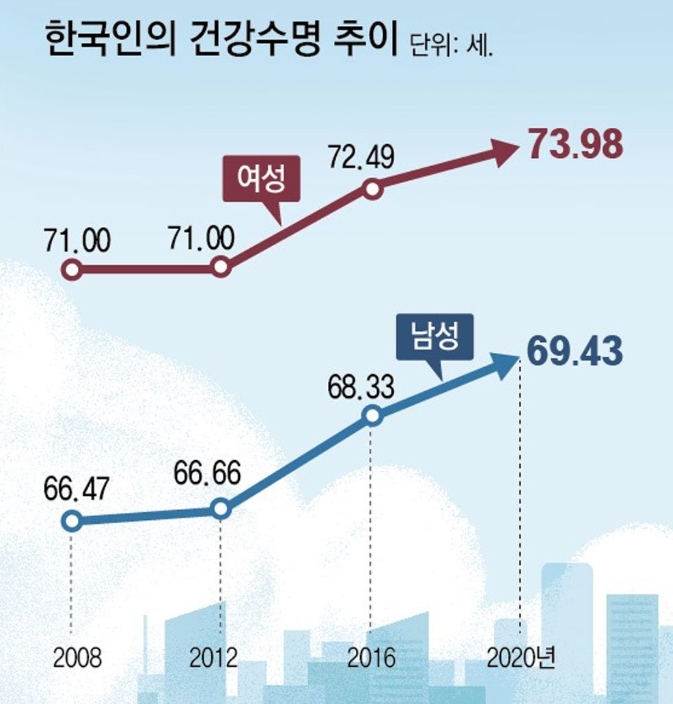 지역별 격차도 심각했다. 세종이 71.0세로 가장 높았고, 부산은 68.32세로 가장 낮았다. 서울 내에서는 강남3구(서초 73.02세, 강남 72.95세, 송파 72.58세)의 건강수명이 높고, 금천구는 69.17세로 가장 낮았다. 지역 간 차이는 2.2년으로 전년 대비 소폭 확대됐다.