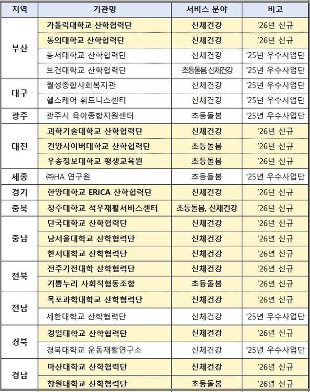 복지부는 지난 3월 12개 시도의 24개 사업단을 선정했는데 이들 사업단은 청년 신체 건강 증진, 초등 돌봄 학습 지원, 초등 돌봄 예술 창의 지원 등 지역사회서비스를 제공한다.