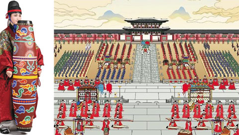 오는 28·29일 오후 4시 경복궁 근정전에서 열리는 "세종, 하늘의 소리를 듣다"는 600년 전 이날의 회례연을 재현한 것. 개원 60주년을 맞은 국립국악원(원장 박일훈)이 2008년 예술의전당에서 초연한 무대를 본래 장소로 끌어내 감동을 전한다. 세종실록·국조오례의·악학궤범 등을 토대로 악기의 종류와 편성, 악대 위치, 연주자 복식 등을 복원했다. 150여명의 악사·150여명의 무용수가 60분간 15세기 궁중예술을 펼쳐낸다. 사용하는 악기와 소품·의상만 5t 트럭 8대 분량이다. 동원되는 악기는 총 66가지. 두 번째 술잔을 올리는 2작(爵)에서 무용수들이 무무(武舞)를 출 때 순·탁·요·탁·응·아·상·독이라는 타악기 연주자 8명도 함께 등장한다. 크고 장식이 화려한 건고(建鼓)는 연회에서 반드시 연주됐지만 기록만 있고 실제 전승되지는 않았던 우리 북. 2008년 복원 이후 이번 공연에서 처음 연주된다. ◆관객 위한 상세한 설명 곁들여야 전통예악의 보는 재미를 살렸다는 칭찬과 관객, 특히 외국인을 고려한 설명이 부족하다는 비판이 공존한다. 국립국악원이 풀어야 할 숙제다. 대본을 쓴 극작가 남동훈씨는 당시 악공의 심정을 일기로 상상해서 썼다. ""국왕 전하 납시오"라는 소리가 들린다. 등줄기가 쭈뼛해진다. 취구에 입술을 댄다. 한 번 고른 숨을 후~욱 하고 불어 넣는다. 내 소리가 울려 퍼진다. 동료들의 숨소리도 함께 얹혀진다. 모든 악기들의 소리가 천지간에 울려 퍼진다. 까마득한 곳으로 날아가는가 싶더니 어느덧 하늘에 오른 기분이 든다…." |