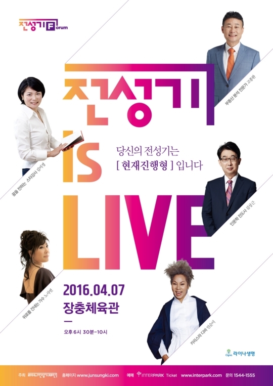 라이나생명이 설립한 라이나전성기재단은 고령화 사회로 접어든 대한민국의 중·장년층을 응원하고 함께 즐기기 위한 ‘전성기포럼’ 행사를 마련했다고 1일 밝혔다. 4월 7일 서울 장충체육관에서 열리는 ‘전성기포럼’은 시니어의 삶을 응원하고 행복한 노후를 살아가는 지혜를 나누기 위한 한마당이다. ‘당신의 전성기는 현재진행형입니다(전성기 is Live)’란 주제로 2500여 명이 참가하게 될 전성기포럼은 스타 강사 김미경 씨와 부동산 투자 전문가 고종완 원장, 인문학 전도사 김상근 교수, 국민 디바 인순이, 위로를 건네는 가수 노사연 등 다양한 출연진들의 강연과 공연으로 꾸며진다. 김일중 아나운서의 사회로 진행되는 이번 행사는 1, 2부로 나뉘어 진행되며, 1부 첫 강연자로 연세대학교 김상근 교수가 나서 ‘어떻게 살 것인가’라는 주제로 강연을 펼친다. 이어 한국자산관리연구원 고종완 원장이 은퇴 후 시니어들의 부동산 관리를 통한 여유로운 삶에 대해 강연하고, 1부 마지막으로는 가수 노사연이 토크와 공연을 결합한 무대를 선보일 예정이다.