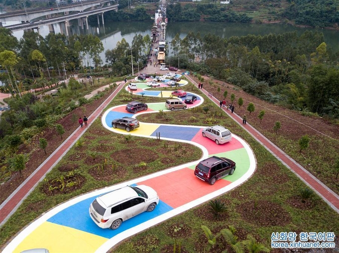 최근 충칭시 한 관광지에서 산길을따라 조성한 S형 컬러 도로가 개통되자 많은 시민들이 차를몰고 ㅊ[험하러 나왔다. [원문출처 : 신화사 통신]